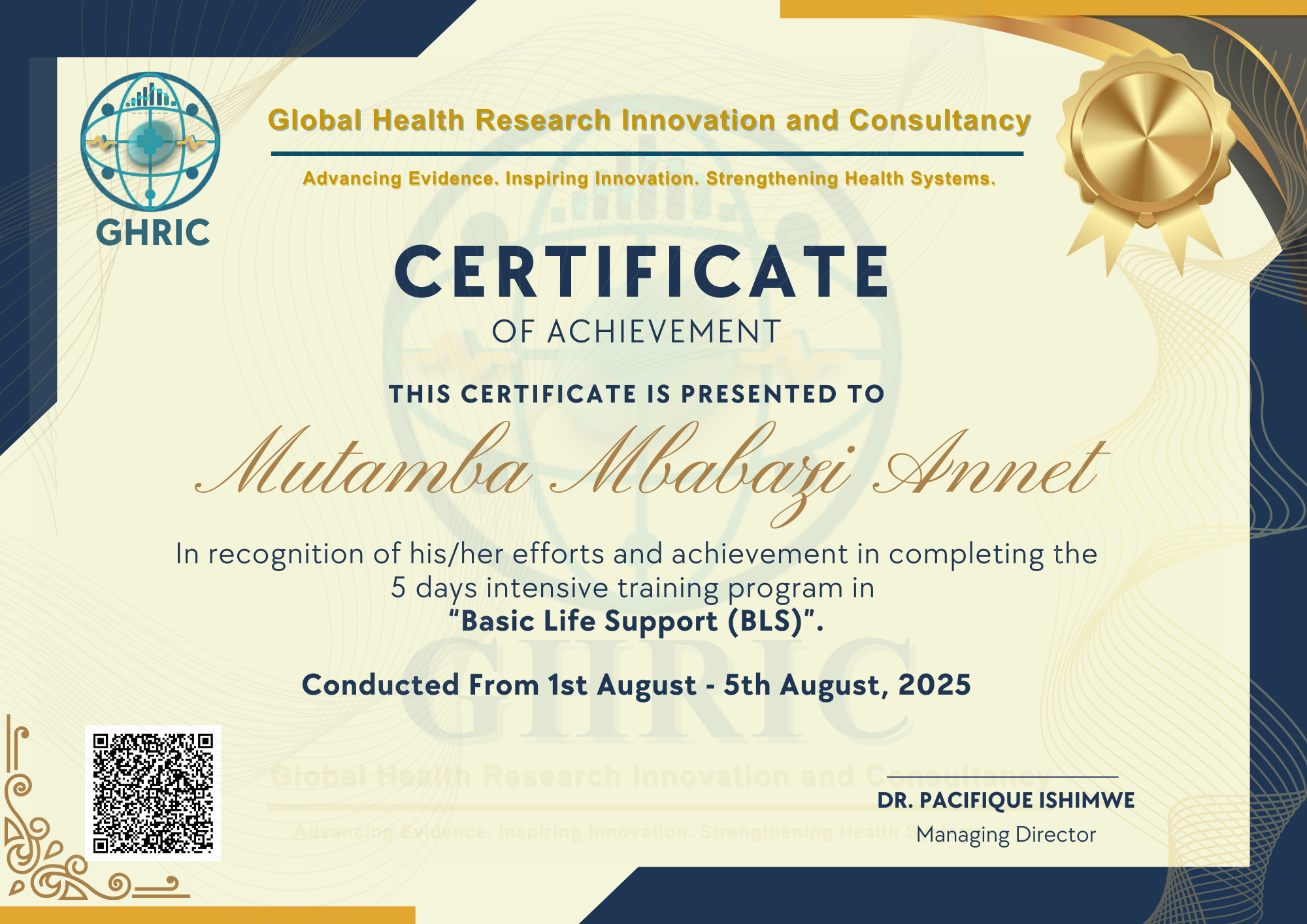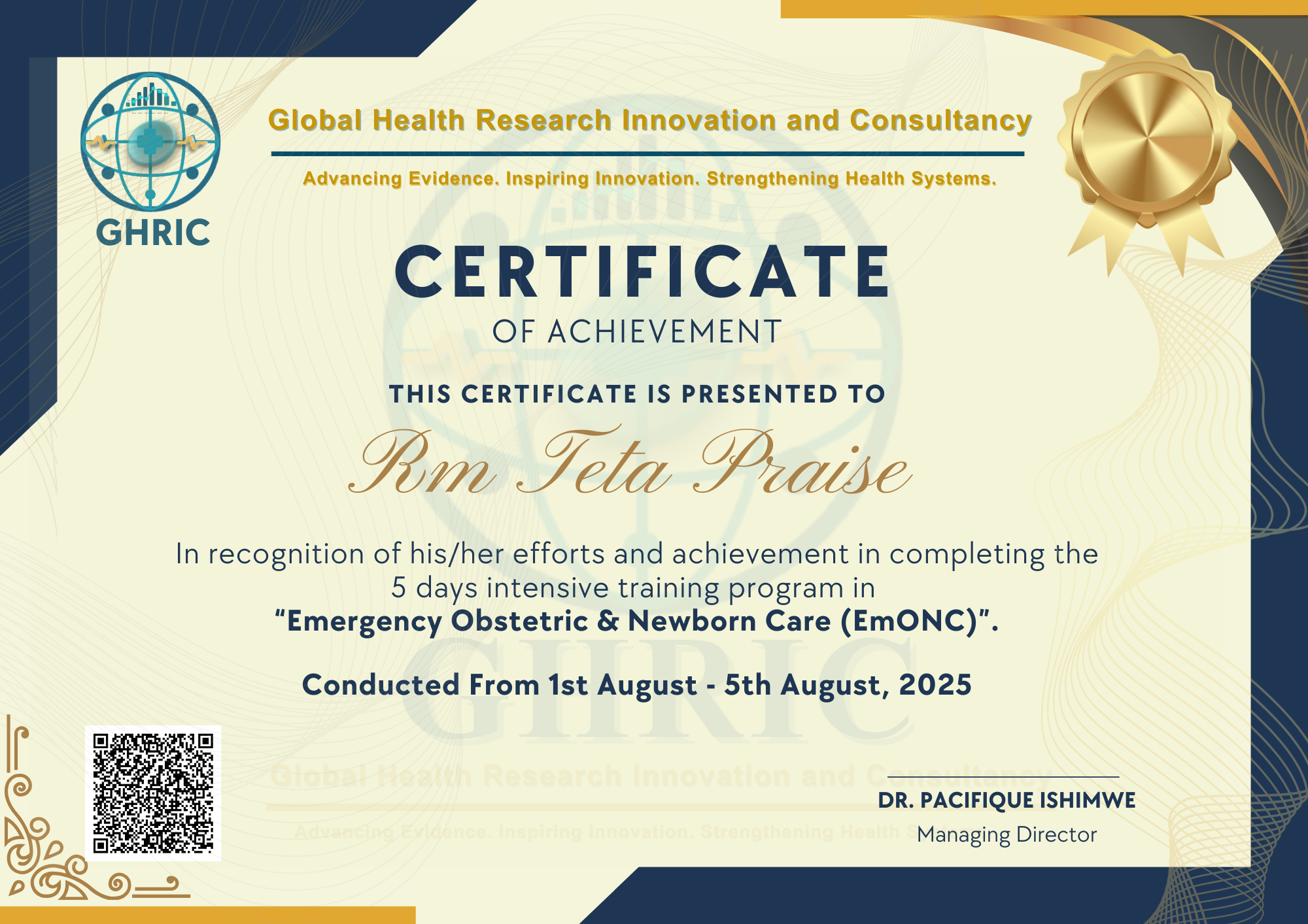 GHRIC is led by Dr. Pacifique Ishimwe, MD, MPH(c)—a clinician, epidemiologist, researcher, and health systems specialist with over seven years of frontline experience in clinical practice, field epidemiology, hospital management, HIV/AIDS program implementation, quality improvement, and health systems strengthening.
